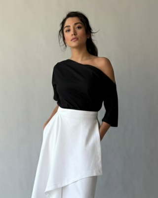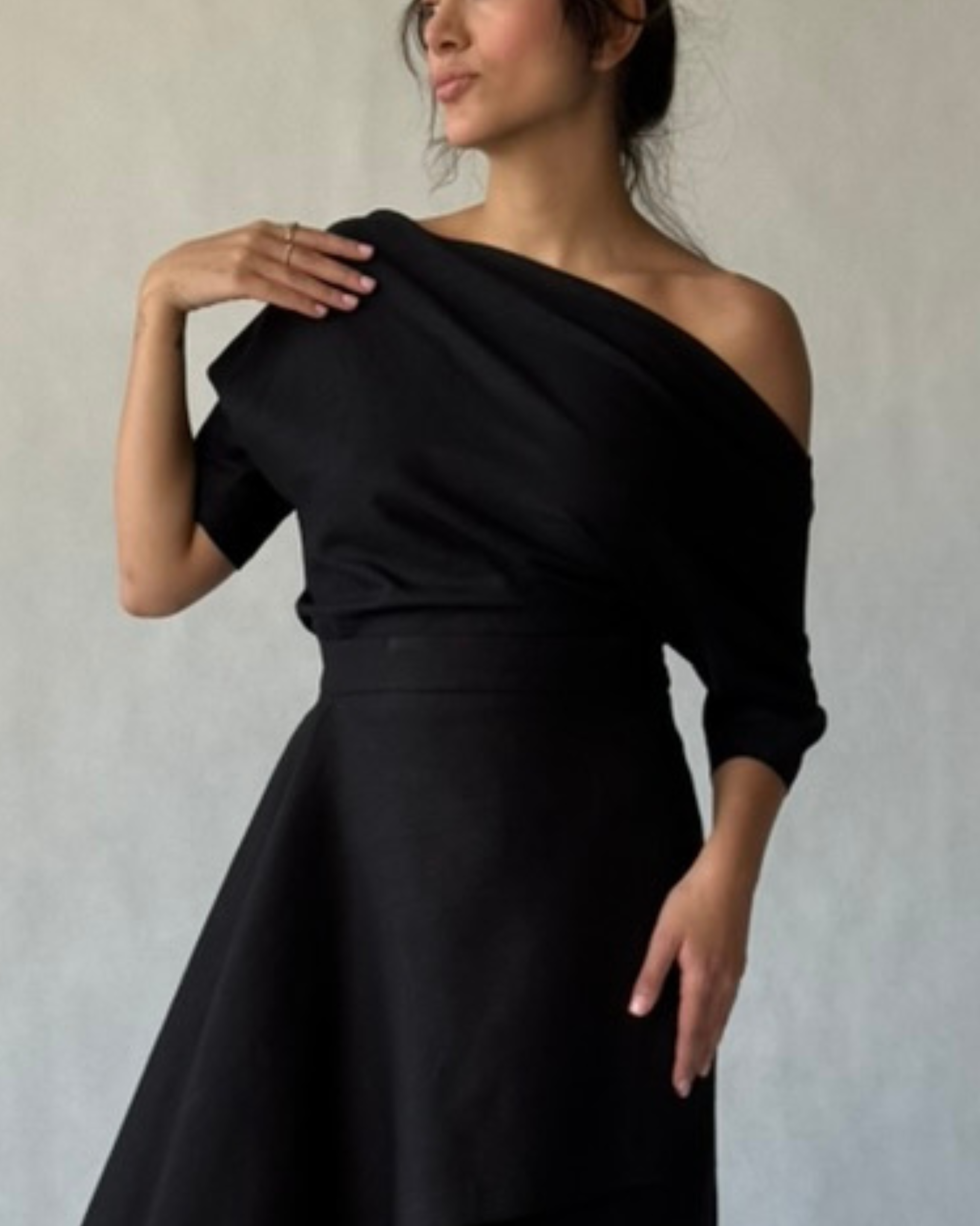 Crafted from a premium linen blend, this blouse features a draped, asymmetrical neckline and a fluid silhouette that flatters the body with understated elegance. The off-shoulder design adds a subtle edge while maintaining the refined simplicity that defines Volume Noir.